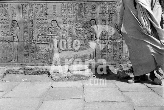 akg916567 Kom Ombo (Oberägypten), Tempel (Doppelheiligtum, dem Krokodilgott Sobek und dem falkenköpfigen Haroeris geweiht; aus ptolemäischer u. römischer Zeit).-Aufseher vor einem Relief.-Foto, 1992.