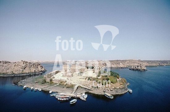 akg999652 Philae / Agilkia (Oberägypten), Nilinsel bei Assuan mit Isisheiligtum (Bauwerke aus ptolemäischer und römischer Zeit; 1980 bei Anlage des Nasser-Stausees von Philae auf die benachbarte Insel Agilkia versetzt).-Gesamtansicht der Insel von Süden.-Foto, 1992.