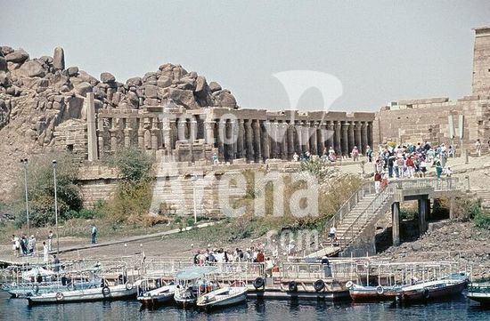 akg999663 Philae / Agilkia (Oberägypten), Isistempel (ptolemäisch, 30.Dynastie, 3.-1.Jh. v.Chr.; 1980 bei Anlage des Nasser-Stausees auf die benachbarte Insel Agilkia versetzt).-Blick vom Festland auf den Tempelvorplatz mit westlichem Säulengang (römische Zeit).-/ Foto, 1992.