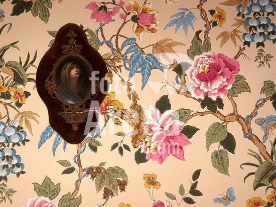 akg993432 Fougèressur-Bièvre (Dép. Loireet-Cher, Blésois, Frankreich), Château de La Boulas (erbaut 1857).-Innenansicht: Marienbild an einer Wand mit Blumentapete.-Foto, 2009.