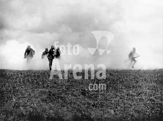 akg1062767 History / First World War:. Chemical Weapons / Poison Gas. Western Front: German soldiers during a gas attack in Flanders. Photo, September 1917.