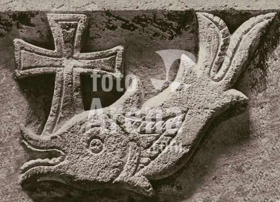 akg4448841 CHRISTIANITY the Christian symbols of the cross and the fish in a coming relief from Erment, in Egypt, of III sec. d.C. Paris, Louvre.