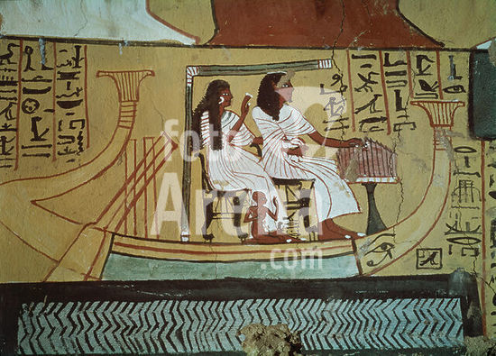 akg1266304 Deir el-Medinah (Theben-West, Ägypten), Grab des Paschedu (TT 3), (Neues Reich, 19. Dynastie, um 1200-1150 v. Chr.). Pilgerreise nach Abydos: Paschedu mit seiner Ehefrau und einem Kind in einem Boot. Wandmalerei. Foto, undat.
