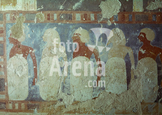 akg362118 Egyptian, Middle Kingdom, 11th dynasty, c. 2000 BC. Unit of Egyptian soldiers (40 men in ten rows) with lances and shields; partial view. Wood, painted, length 169.8cm, width. 62cm, height 5.9cm. From the Tomb of Mesehti in Asyut. JE 30986 (CG 258). Cairo, Egyptian Museum. Museum: Cairo, Egyptian Museum.