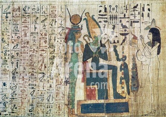 akg1349620 Ägyptisch, Altes Reich. Opferszene mit Osiris und Hathor. Aus einem Totenbuch. Malerei auf Papyrus. Kairo, Ägyptisches Museum. Museum: Cairo, Egyptian Museum.