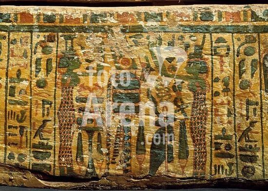 akg810103 El Kab (Upper Egypt), rock tombs, Tomb of Paheri (New Kingdom, 18th Dynasty, rule of Thutmose III, c. 1450 BC), west wall, northern stretch.-Funeral rites (detail): mummy of Paheri on a barque with two mourners in the form of Isis and Nephthys.-Relief, painted.