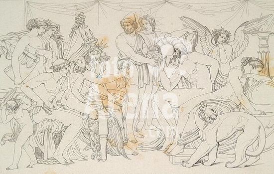 akg177916 Genelli, Bonaventura. 1798-1868. - The wounded Mars bathing, being tended by Hebe. (Iliad V, 904-905). Contour engraving. From: B.Genelli's Umrisse zum Homer mit Erläuterungen von Dr. Ernst Förster, Stuttgart and Tübingen (J.G. Cotta'scher Verlag) 1844, plate VI. Berlin, Sammlung Archiv für Kunst und Geschichte. Museum: Berlin, Sammlung Archiv für Kunst und Geschichte.