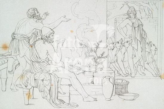 akg177960 Genelli, Bonaventura; 1798-1868. Circe returns the companions of Odysseus to their human form, having turned them into pigs. (Odyssey X, 388). Outline engraving, from: B.Genelli's Umrisse zum Homer mit Erläuterungen von Dr. Ernst Förster, Stuttgart und Tübingen (J.G. Cotta'scher Verlag) 1844, Table X. Berlin, Sammlung Archiv für Kunst und Geschichte. Museum: Berlin, Sammlung Archiv für Kunst und Geschichte.
