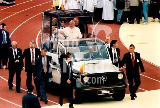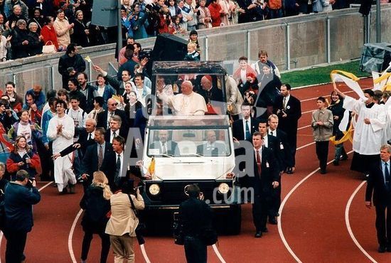 akg187151 John Paul II, Pope (1978-2005)) real name Karol Wojtyla; born 1920. Berlin, 23 June 1996: Pope John Paul II celebrates mass in the Olympiastadion: the Pope in his "Popemobile" travelling through the stadium. Copyright: For editorial use only.