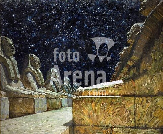 akg387263 Klee, Paul. 1879-1940. "Gerüst für den Kopf einer Monumental-Plastik" (Sphinx) (Supporting structure for the head of a monumental sculpture (Sphinx) ), 1923, 122. Oil transfer and watercolour on paper, on cardboard, 21.8 × 37.4cm. Private Collection. Museum: PRIVATE COLLECTION. Copyright: Additional copyrights may need to be cleared on this image when licensed for use by clients in the USA. Please contact us for additional information.