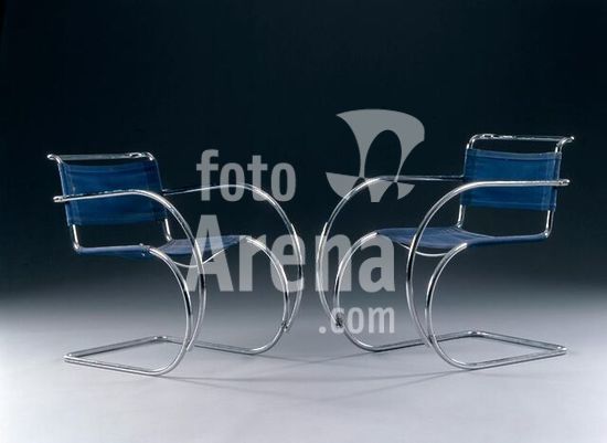 akg380135 Furniture / seating furniture / chairs. - Two chairs (of four) "Weißenhof MR 20". Design, 1927, by Ludwig Mies van der Rohe (1886-1969). tubular steel, chromium plated, original canvas cover, height 79.5cm. London, Sotheby's, 31.10.1997, Lot 1301. Copyright: This artwork is not in the public domain. It is your responsibility to obtain all necessary third party permissions from the copyright handler in your country prior to publication. © Ludwig Mies van der Rohe.