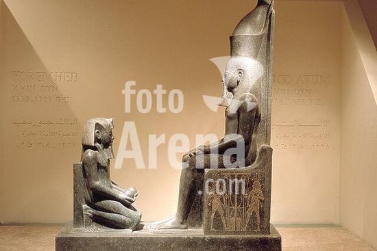 akg422122 Horemheb, last Egyptian Pharaoh of the. 18th dynasty, reigned 1333-1306 BC. Horemheb, offering, kneels before god Atum. Sculpture, c. 1300 BC. Diorite; height 190,7cm, depth 151.5cm, width 83.5cm. Finding place: Luxor Temple, Cachette. Luxor, Museum. Museum: Luxor, Museum.
