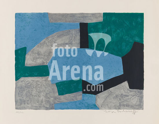akg8200627 Poliakoff, Serge1900 Moskau - 1969 ParisComposition grise, verte et bleue. 1966. Farblithografie auf Rives (Wasserzeichen). 48,5 x 63cm (63 x 80cm). Signiert und nummeriert. Kunstverein St. Gallen (Hrsg.). Ex. 103/150. Modellrahmen. - Partiell minimalster Lichtrand. Griffspuren. Knickspuren an der oberen und unteren Kante. Verso minimale Verschmutzungen. Reste alter Montierung. Mit dem Trockenstempel des Druckers Erker Presse, St. Gallen. WVZ. Poliakoff/Schneider, WVZ.-Nr. 54. . Kunsthandel, Van Ham. Copyright: © Serge Poliakoff. This artwork is not in the public domain. Additional copyright clearance may be required before use of this image.