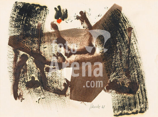 akg8209888 Hartung, Hans1904 Leipzig - 1989 AntibesOhne Titel. 1963. Lithografie auf ARCHES. 51 x 63,5cm (57 x 76,5cm). Signiert und nummeriert. Kunstverein für die Rheinlande und Westfalen, Düsseldorf (Hrsg.). Ex. 126/200. Rahmen. - Blatt partiell unterschiedlich gebräunt. Minimale Knickspuren. Wasserfleck (ca. 3 x 1cm) und Stecknadelloch im oberen linken Eckbereich. Durchgeschlagene ehemalige Montierung in den oberen Eckbereichen. Verso Verschmutzungen. Reste und Spuren alter Montierung.WVZ. Mason, WVZ.-Nr. L 105.II.b. Mit dem Trockenstempel der Erker Presse, St. Gallen. Jahresgabe des Herausgebers. . Kunsthandel, Van Ham. Copyright: © Hans Hartung. This artwork is not in the public domain. Additional copyright clearance may be required before use of this image.