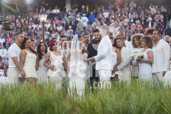 ny090226161312 A couple gets married live onstage as singer Bad Bunny performs during the Super Bowl LX halftime show at Levi's Stadium in Santa Clara, Calif., on Sunday, Feb. 8, 2026. The couple married on the field had invited the Puerto Rican singer to their wedding, but instead received an invitation to appear onstage with him, his management said. (Doug Mills/The New York Times/Fotoarena)