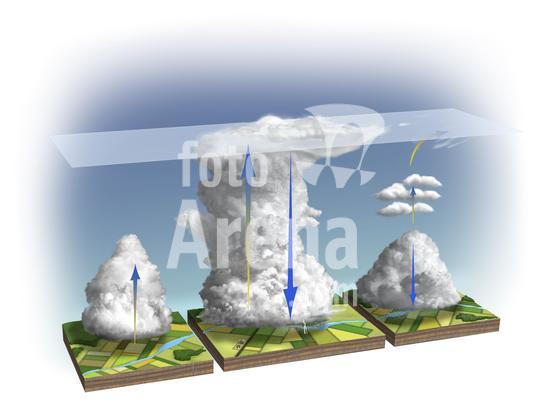 1016_03_58224 The life cycle of a thunderstorm cell has three stages. In the development stage, the updraft of a humid air mass forms a cumulus cloud. If the air is unstable, warm currents continue to rise, and the cloud grows to the cumulonimbus stage. When it reaches the tropopause, the cloud stops developing in height and becomes loaded with ice crystals that begin the precipitation process. The thunderstorm then enters its maturity stage: the cold, heavy air from the top of the cloud suddenly falls in the form of strong currents accompanied by lightning and heavy showers. The thunderstorm dissipates when the winds from the top of the cloud cool the ground to the point where the cloud is deprived of the warm air that was feeding it. The cumulonimbus cloud disintegrates, the rain stops, and only a few inoffensive cirrus and altocumulus clouds remain in the sky.