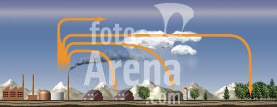 1016_03_58304 Most pollutants fall to Earth in the form of dry deposits near the source of the pollution. The rest, carried by the wind, drift for several hundred kilometers before falling to the ground due to precipitation. When they reach a high altitude, some gases may be transported by the wind and deposited thousands of kilometers from their place of origin. CFCs reach the stratosphere, where they contribute to depletion of the ozone layer.