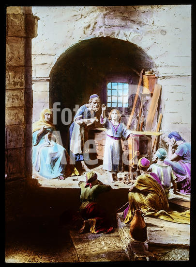 902_05_12519071highres A hand coloured magic lantern slide circa 1900.The 'Statutype' series of the life and work of Christ on Earth. This is a very fine and entirely new set of Slides, photographed from an original series of models sculptured by the French artist, Mestroianni. On the screen they appear almost stereoscopic, standing out well in relief owing to the shadows being real shadows, not merely painted. They are quite unique in appearance and very attractive, being printed, by a special process of our own, in a warm brown art tone. Great transparency is obtainable with this new process (Newtona), making these Slides very suitable for oil and acetylene lanterns. Messrs. Newton & Co. hold the sole right of making Slides of these copyright subjects in all English-speaking countries.Postcards of the above pictures can be obtained from Mr Noyer, 37, Boulevard de Strasbourg, Paris. Slide 6 The Flight into Egypt. Illustrator MASTROIANNI, Domenico
