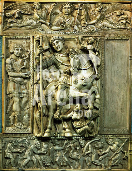 orz003160 Ivory diptych. Detail from the emperor on a horse. Byzantine 6th century. 34 x 26.6 cm. Paris, musée du Louvre. Location: MUSEO DEL LOUVRE-EBORARIA-MARFILE. France. JUSTINIAN I. ZENON DE CITIO. CRISTO IMBERBE. ATANASIO-DISCIPULO DE SANTIAGO APOSTOL.