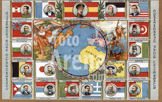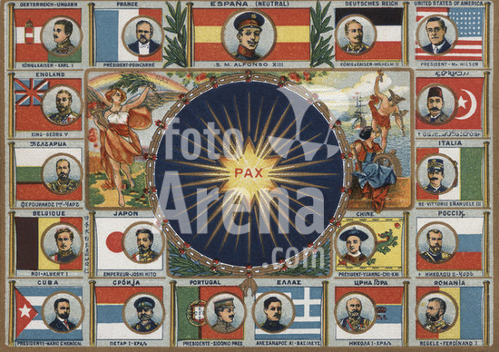 Tarjeta postal conmemorativa de la Paz Universal, una vez finalizada la primera guerra mundial (1914-1918). Países, banderas y dirigentes mundiales: Imperio austro-húngaro, emperador Carlos I (1887-1922); Inglaterra, rey George V (1865-1936); Bulgaria, zar Fernando I (1861-1948); Bélgica, rey Alberto I (1875-1934); Cuba, presidente Mario García Menocal (1866-1941); Francia, presidente Henri Poincaré (1854-1912); Japón, emperador Hiro-Hito (1901-1989); Serbia, rey Pedro I (1844-1921); España, rey Alfonso XIII (1886-1941); Portugal, presidente Sidonio Paes (1872-1918); Grecia, rey Alejandro I (1893-1920); Alemania, kaiser Guillermo II (1859-1941); China, presidente Yuan Shikai (1859-1916); Montenegro, rey Nicolás I (1841-1921); Estados Unidos de América del Norte, presidente Woodrow Wilson (1856-1924); Imperio Otomano, sultán Mehmet VI (1861-1926); Italia, rey Victor Manuel III (1869-1947); Rusia, zar Nicolás II (1868-1918); Rumania, rey Fernando I (1865-1927). Año 1918.