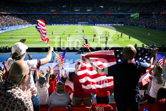 ny170619131604 Fans wave the flag of the United States during the Women's World Cup match between the U.S. and Chile in Paris, June 16, 2019. Menacing and dominating a second straight opponent, the United States women?s national team advanced to the second round of the World Cup with a 3-0 victory against Chile on Sunday. (Pete Kiehart/The New York Times/Fotoarena)