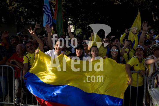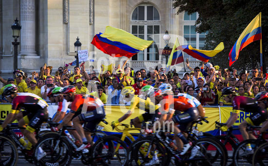 ny280719182204 Fans wave the flag of Colombia and cheer during the final stage of the Tour de France in Paris on July 28, 2019. Egan Bernal, 22, of Colombia, became the first South American to win the Tour. (Pete Kiehart/The New York Times/Fotoarena)
