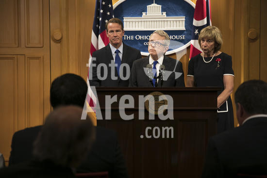 ny060819131904 Gov. Mike DeWine of Ohio makes an announcement, proposing adopting a version of a Òred flag law,Ó which would allow the authorities to take firearms from a person deemed by a court to be dangerous, at the Statehouse in Columbus, Ohio, on Tuesday, Aug. 6, 2019. Also pictured is Ohio Lt. Gov. Jon Husted, center, and DeWine's wife, Frances DeWine. (Maddie McGarvey/The New York Times/Fotoarena)