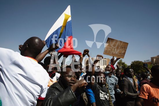 ny250122192904 Crowds celebrate the military takeover in a plaza in Ouagadougou, the capital of Burkina Faso on Tuesday, Jan. 25, 2022, where they brandished a Russian flag and signs that said, ?No to France.? Fed up with the failure of their government, with French help, to stop the violence caused by militants, some Africans now call for Russia to intervene. (Malin Fezehai/The New York Times/Fotoarena)