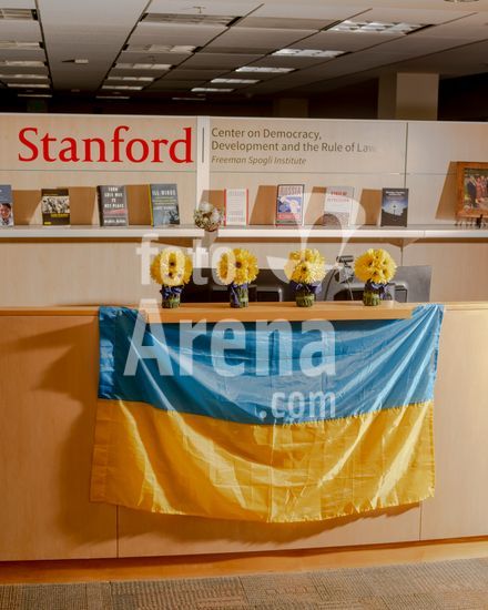 ny100522162605 A Ukraine flag at the reception desk of the Freeman Spogli Institute for International Studies, where Francis Fukuyama is a visiting scholar, at Stanford University in Palo Alto, Calif., April 30, 2022. FukuyamaÕs new book, ÒLiberalism and Its Discontents,Ó offers a stout defense of liberalism against threats from left and right Ñ and predicts that the conflict in Ukraine will revive Òthe spirit of 1989.Ó (Jim McAuley/The New York Times/Fotoarena)