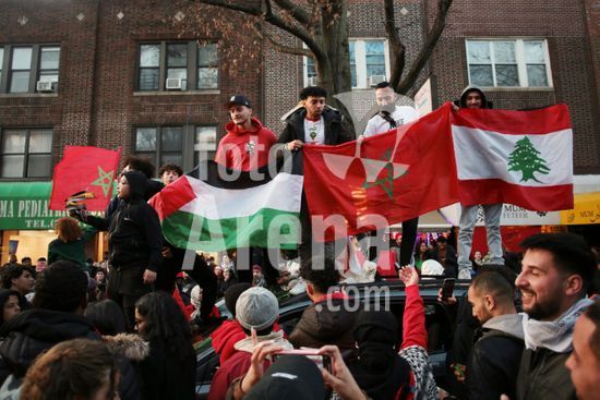 ny141222205506 Fans holding the national flags of Palestine, Morocco and Lebanon stand on top of a car in Astoria, Queens after the 2022 World Cup match between Morocco and France, on Wednesday, Dec. 14, 2022. Despite a loss against France, fans of Morocco?s team spilled onto the streets to celebrate. (Rengim Mutevellioglu/The New York Times/Fotoarena)