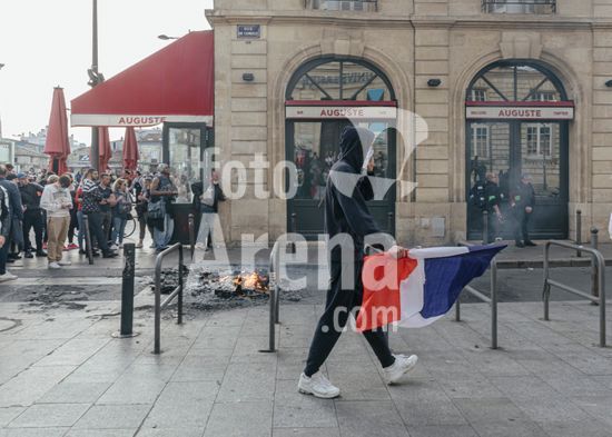 ny280323200406 A demonstrator carries a French flag during a protest against pension reform outside the University of Bordeaux in Bordeaux, France, March 28, 2023. Neither President Emmanuel Macron nor opponents of his pension overhaul were ready to back down on a new day of strikes and marches, with fears of rising anger and violence. (Andrea Mantovani/The New York Times/Fotoarena)