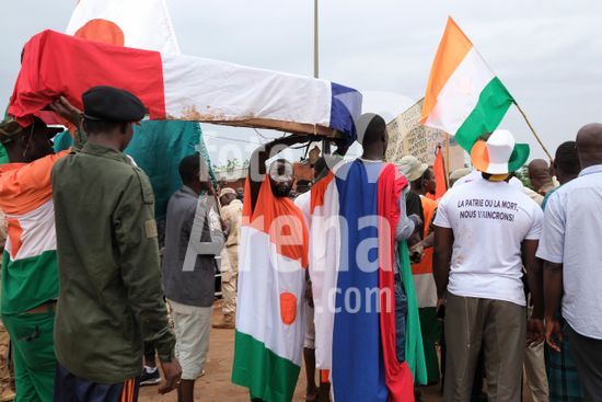 ny300923205507 **EMBARGO: No electronic distribution, Web posting or street sales before 3:01 a.m. ET Sunday, Oct. 1, 2023. No exceptions for any reasons. EMBARGO set by source.** Protesters carrying a fake coffin draped in a French flag that they said was meant for President Emmanuel Macron of France, in Niamey, Niger on Sept. 2, 2023. Among the sea of flags flying high in a burst of patriotic fervor in Burkina Faso, Mali and lately Niger, countries that have recently undergone military coups, the red, white and blue flag of the Russian Federation has become commonplace. While it carries political overtones, it has emerged as a trendy accessory, much like a Che Guevara illustration a generation ago in the West. (Elian Peltier/The New York Times/Fotoarena)