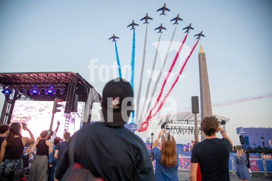 ny210923162006 An aeronautical team blazes the colors of the French flag above the fan zone for the Rugby World Cup, on the Place de la Concorde in central Paris, Sept. 8, 2023. French fans have packed out stadiums, the Place de la Concorde and other venues to show their support for rugby in a land where soccer rules. (James Hill/The New York Times/Fotoarena)