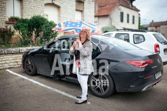 ny060724151110 Sophie-Laurence Roy, candidate for the far-right National Rally, with an umbrella in the colors of the Burgundy flag in Nitry, near Chablis, France, July 3, 2024. ÒMy problem is not the past, itÕs tomorrow,Ó Roy says of her decision to run as a National Rally candidate. (Dmitry Kostyukov/The New York Times/Fotoarena)