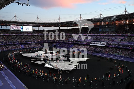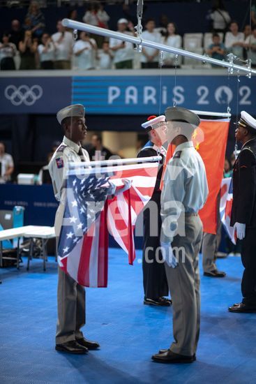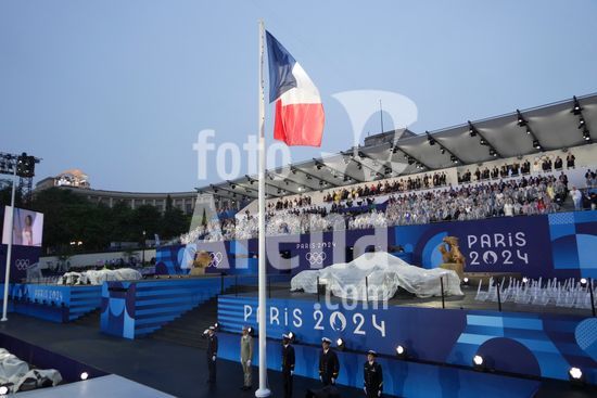 ny280724230911 A flag raising ceremony during the first day of the 2024 Summer Olympics at the Olympic Aquatics Centre in Saint-Denis, France, July 27, 2024. There are 10,000 athletes at the Paris Games, spread across 32 sports Ñ in the space of 19 days, that field has to be whittled down to just 329 gold medals. (Dmitry Kostyukov/The New York Times/Fotoarena)