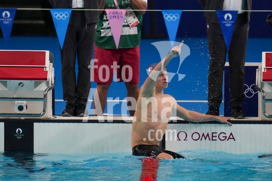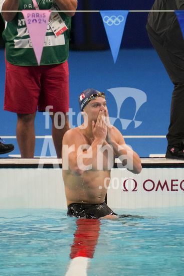 ny280724180511 L?on Marchand of France reacts after winning the men's 400m individual medley final at La Defense Arena during the 2024 Summer Olympics in Paris on Sunday, July 28, 2024. Barely four minutes after he dived into the pool, Marchand climbed out, French flags waving all about Ñ his time of 4:02.95 set an Olympic record. (Daniel Berehulak/The New York Times/Fotoarena)