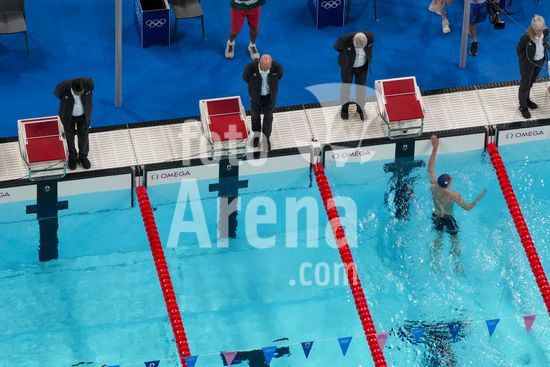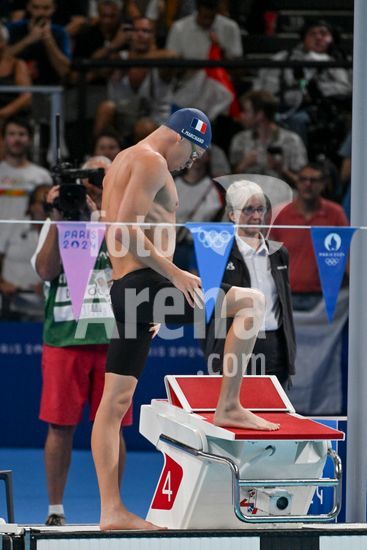 ny280724180111 L?on Marchand of France prepares to compete in the men's 400m individual medley final at La Defense Arena during the 2024 Summer Olympics in Paris on Sunday, July 28, 2024. Barely four minutes after he dived into the pool, Marchand climbed out, French flags waving all about Ñ his time of 4:02.95 set an Olympic record. (James Hill/The New York Times/Fotoarena)