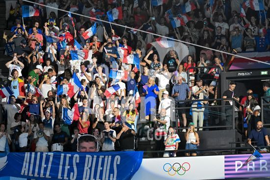 ny280724175811 Fans wave French flags as L?on Marchand of France competes in the men's 400m individual medley final at La Defense Arena during the 2024 Summer Olympics in Paris on Sunday, July 28, 2024. Barely four minutes after he dived into the pool, Marchand climbed out, French flags waving all about Ñ his time of 4:02.95 set an Olympic record. (James Hill/The New York Times/Fotoarena)