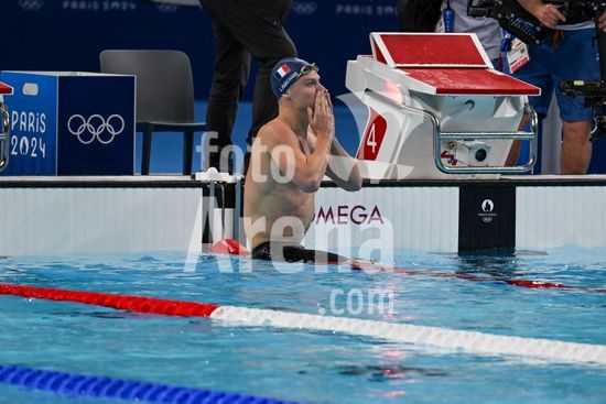 ny280724180911 L?on Marchand of France reacts after winning the men's 400m individual medley final at La Defense Arena during the 2024 Summer Olympics in Paris on Sunday, July 28, 2024. Barely four minutes after he dived into the pool, Marchand climbed out, French flags waving all about Ñ his time of 4:02.95 set an Olympic record. (James Hill/The New York Times/Fotoarena)