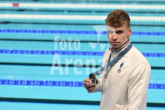 ny280724180811 L?on Marchand of France after winning gold in the men's 400m individual medley final at La Defense Arena during the 2024 Summer Olympics in Paris on Sunday, July 28, 2024. Barely four minutes after he dived into the pool, Marchand climbed out, French flags waving all about Ñ his time of 4:02.95 set an Olympic record. (James Hill/The New York Times/Fotoarena)