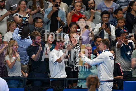 ny280724180711 L?on Marchand of France greets fans after winning gold in the men's 400m individual medley final at La Defense Arena during the 2024 Summer Olympics in Paris on Sunday, July 28, 2024. Barely four minutes after he dived into the pool, Marchand climbed out, French flags waving all about Ñ his time of 4:02.95 set an Olympic record. (James Hill/The New York Times/Fotoarena)