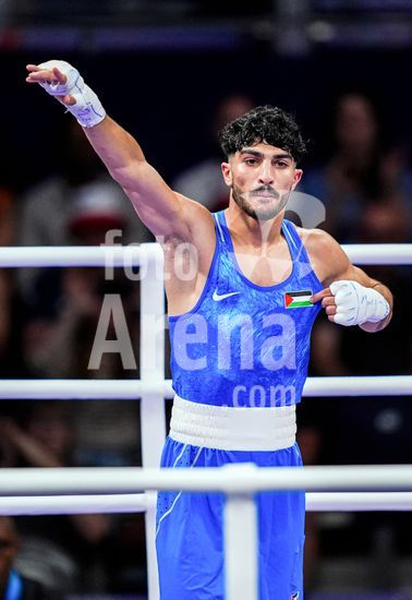 ny310724003116 **EMBARGO: No electronic distribution, Web posting or street sales before 12:01 a.m. Wednesday, July 31, 2024. No exceptions for any reasons.** Wasim Abusal of Palestine points to the flag on his uniform after losing to Nebil Ibrahim of Sweden in a men?s 57kg boxing match during the 2024 Paris Olympic Games at North Paris Arena in Paris, on July 28, 2024. The Israel-Hamas war has given the eight Palestinians competing in Paris Olympics a higher profile than usual. (Daniel Berehulak/The New York Times/Fotoarena)