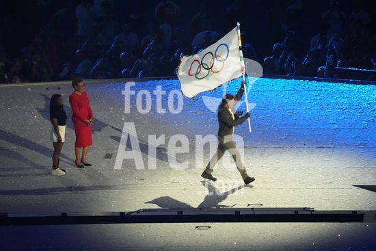 ny080821135604 Anne Hidalgo, Mayor of Paris, center, stands with International Olympic Committee's President Thomas Bach, second left, as they raise up the flag of France during closing ceremony of the postponed 2020 Summer Olympics in Tokyo, on Sunday, Aug. 8, 2021. (James Hill/The New York Times/Fotoarena)