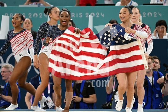 ny050824163212 Simone Biles, left, and Sunisa Lee of the U.S. carry the flag as they celebrate with their teammates after winning the gold medal in the women's artistic gymnastics team finals at the 2024 Summer Olympics in Paris on Tuesday, July 30, 2024. Biles sealed her legacy with four medals at the Paris Games. She created it by being herself and going at her own pace. (James Hill/The New York Times/Fotoarena)