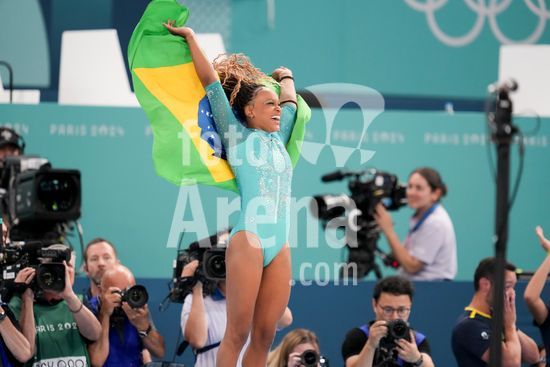 ny050824110312 Rebeca Andrade of Brazil waves a Brazilian flag after winning gold in the artistic gymnastics women's floor exercise final at Bercy Arena during the 2024 Olympic Games in Paris, on Monday, Aug. 5, 2024. (Chang W. Lee/The New York Times/Fotoarena)