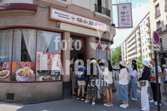 ny060824115012 A line forms outside Yang Xiao Chu, a petite Chinese restaurant near the table tennis venue in the 15th arrondissement of Paris which has become an unofficial clubhouse for athletes, team officials and fans alike, on Aug. 2, 2024. Customers, often carrying flags and homemade banners, have learned of the restaurant by word of mouth and Chinese social media platforms like Little Red Book. (Weiyi Cai/The New York Times/Fotoarena)