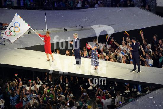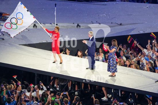 ny080821140004 Anne Hidalgo, Mayor of Paris, center, stands with International Olympic Committee's President Thomas Bach, second left, as they raise up the flag of France during closing ceremony of the postponed 2020 Summer Olympics in Tokyo, on Sunday, Aug. 8, 2021. (James Hill/The New York Times/Fotoarena)