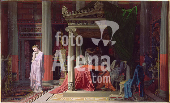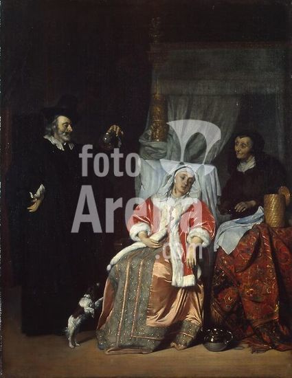 The Lovesick Maiden. Artist: Jan Steen (Dutch, Leiden 1626-1679 Leiden). Dimensions: 34 x 39 in. (86.4 x 99.1 cm). Date: ca. 1660.Doctors were familiar targets of parody in Steen's native Leiden, the home of a famous medical school. Borrowing from the comic stage, Steen identifies the old man as a quack by his peculiar clothing, while the nature of the young lady's malady is suggested by the Cupid over the door, and other intimations like the open bed. The picture dates about 1660. Museum: Metropolitan Museum of Art, New York, USA.