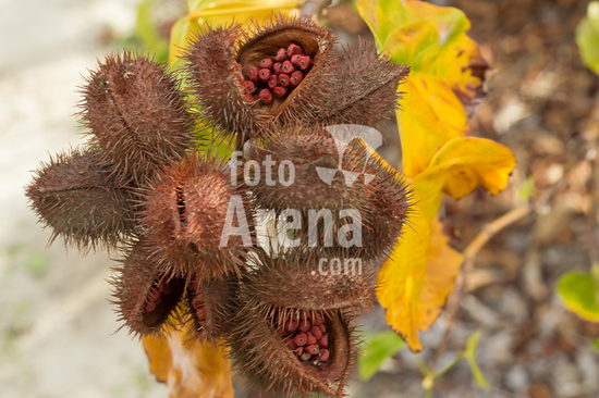 2554138 Urucum, também grafado urucu, é o fruto do urucuzeiro ou urucueiro (Bixa orellana) em Marilia (SP).,Arvoreta da família das bixáceas, nativa na América tropical, com folhas de cor verde-claro e flores rosadas com muitos estames. Seus frutos são cápsulas armadas por espinhos maleáveis, que se tornam vermelhas quando ficam maduras. Então se abrem e revelam pequenas sementes dispostas em série, de trinta a cinquenta por fruto, envoltas em arilo também vermelho.