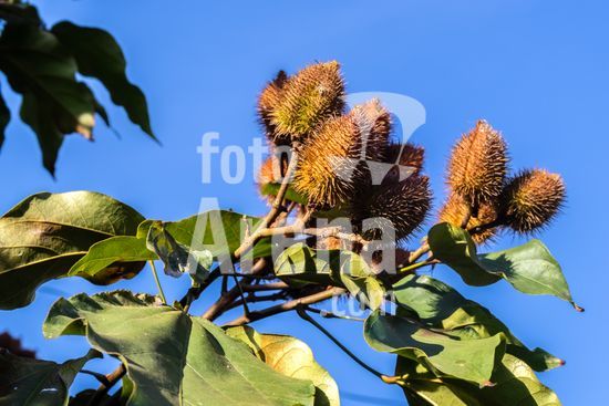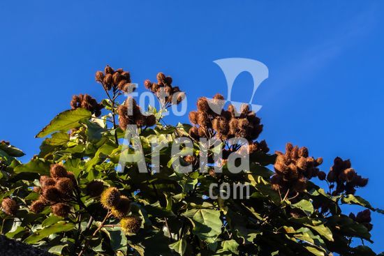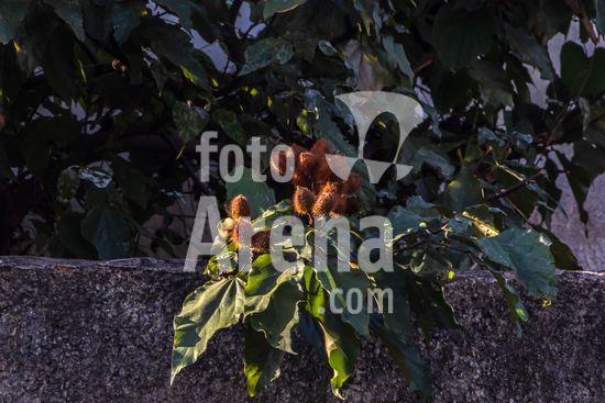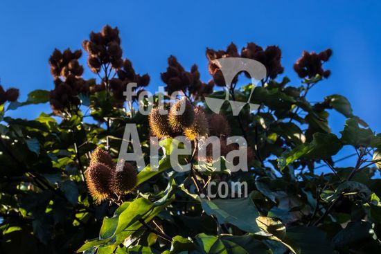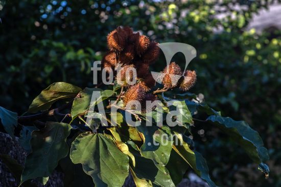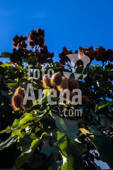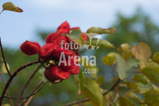 2554154 Urucum, também grafado urucu, é o fruto do urucuzeiro ou urucueiro (Bixa orellana) em Marilia (SP).,Arvoreta da família das bixáceas, nativa na América tropical, com folhas de cor verde-claro e flores rosadas com muitos estames. Seus frutos são cápsulas armadas por espinhos maleáveis, que se tornam vermelhas quando ficam maduras. Então se abrem e revelam pequenas sementes dispostas em série, de trinta a cinquenta por fruto, envoltas em arilo também vermelho.